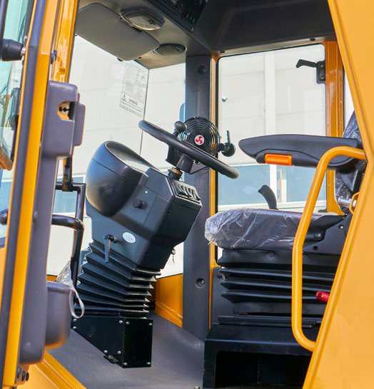Кабина катков KAYTEC спроектирована с приоритетом комфорта и безопасности оператора. Большая площадь остекления обеспечивает отличный круговой обзор, а эффективная система освещения и стеклоочистители на лобовом и заднем стекле делают работу безопасной в любое время суток. Встроенная защитная дуга ROPS соответствует международным стандартам безопасности и защищает оператора при опрокидывании. Регулируемое подпружиненное кресло с подлокотниками, ремнем безопасности и настраиваемой рулевой колонкой снижает усталость при длительной работе. Интуитивно понятная панель управления с тумблерами и пиктограммами реализована по принципу «одна функция — один переключатель». Гидростатическое рулевое управление и рычаг движения обеспечивают точный и комфортный контроль, а дополнительные удобства — розетка, вентилятор и аудиосистема — создают максимально комфортные условия для оператора.